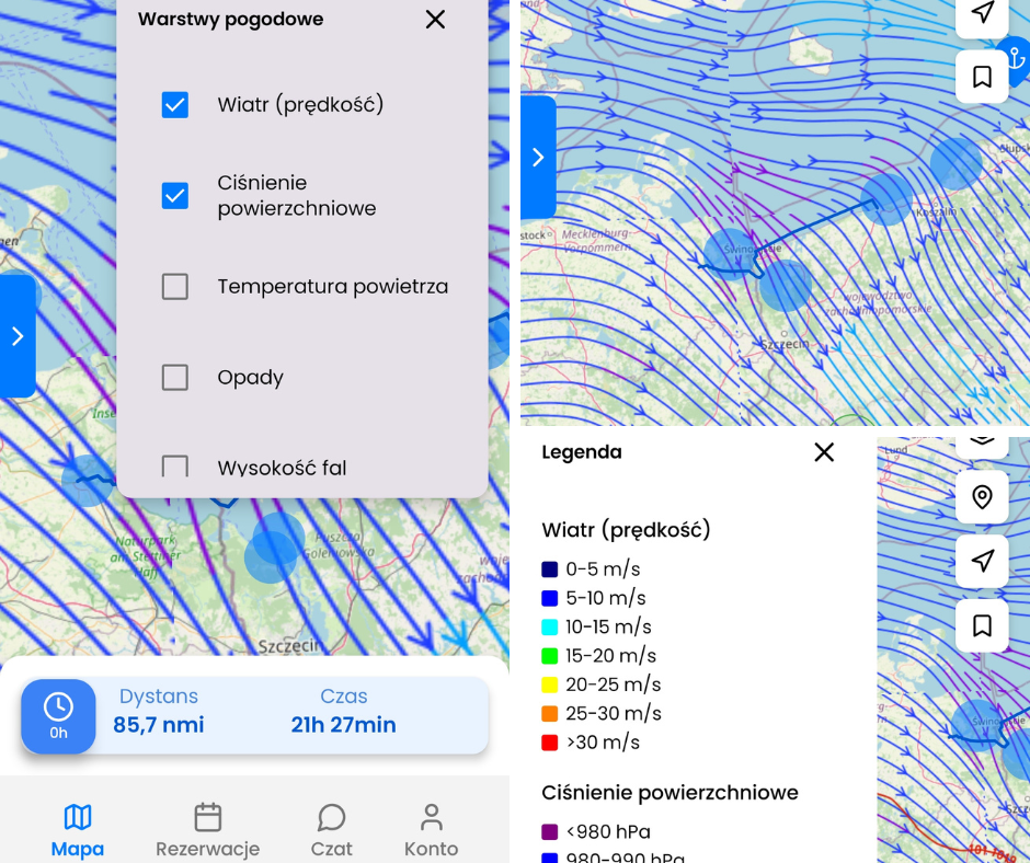 Dodatkowo w aplikacji dostępna jest nakładka pogodowa na mapie, w której można włączyć wybrane warstwy danych: wiatr (prędkość), ciśnienie przy powierzchni, temperatura powietrza, opady oraz wysokość fali.